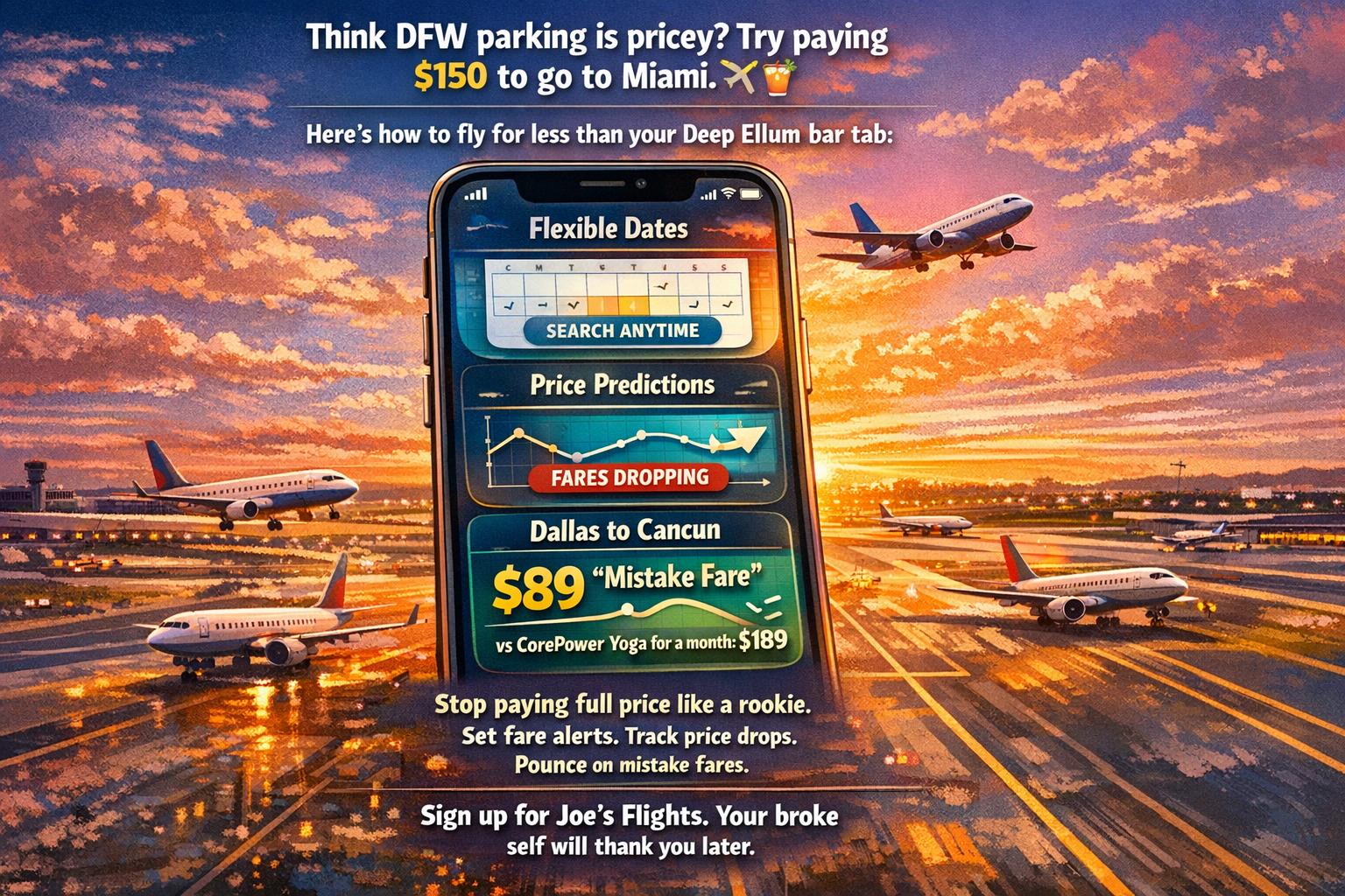 | Joe's Flights | Yes (Dallas-only) | Alerts include date windows | Yes (DFW & DAL exclusively) | No | Yes (Dallas-specific) |